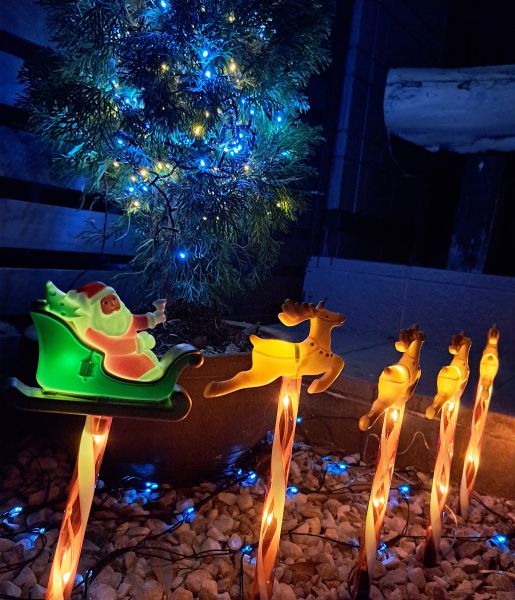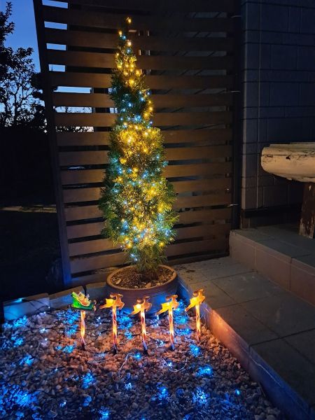 コニファー(針葉樹)を植木鉢に移してイルミネーションやサンタさん&トナカイを飾り、玄関先は一気に華やかな雰囲気に!✨